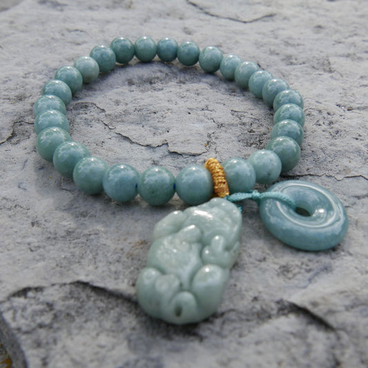 Blue Water Jade Bracelet (6.5-7mm) with Jade Donut and Pixiu Charms